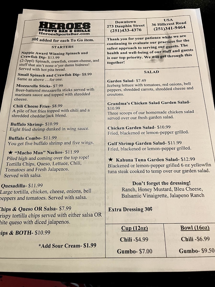 Welcome to Heroes Sports Bar & Grille - West Mobile, a gem nestled in the heart of Mobile, Alabama. Located at 36 Hillcrest Rd, this venue is not just about great food; it's about a vibrant community atmosphere where sports, friends, and delicious meals come together. Whether you're catching the big game on one of their many screens or looking for a spot to unwind with friends, Heroes is the place to be.